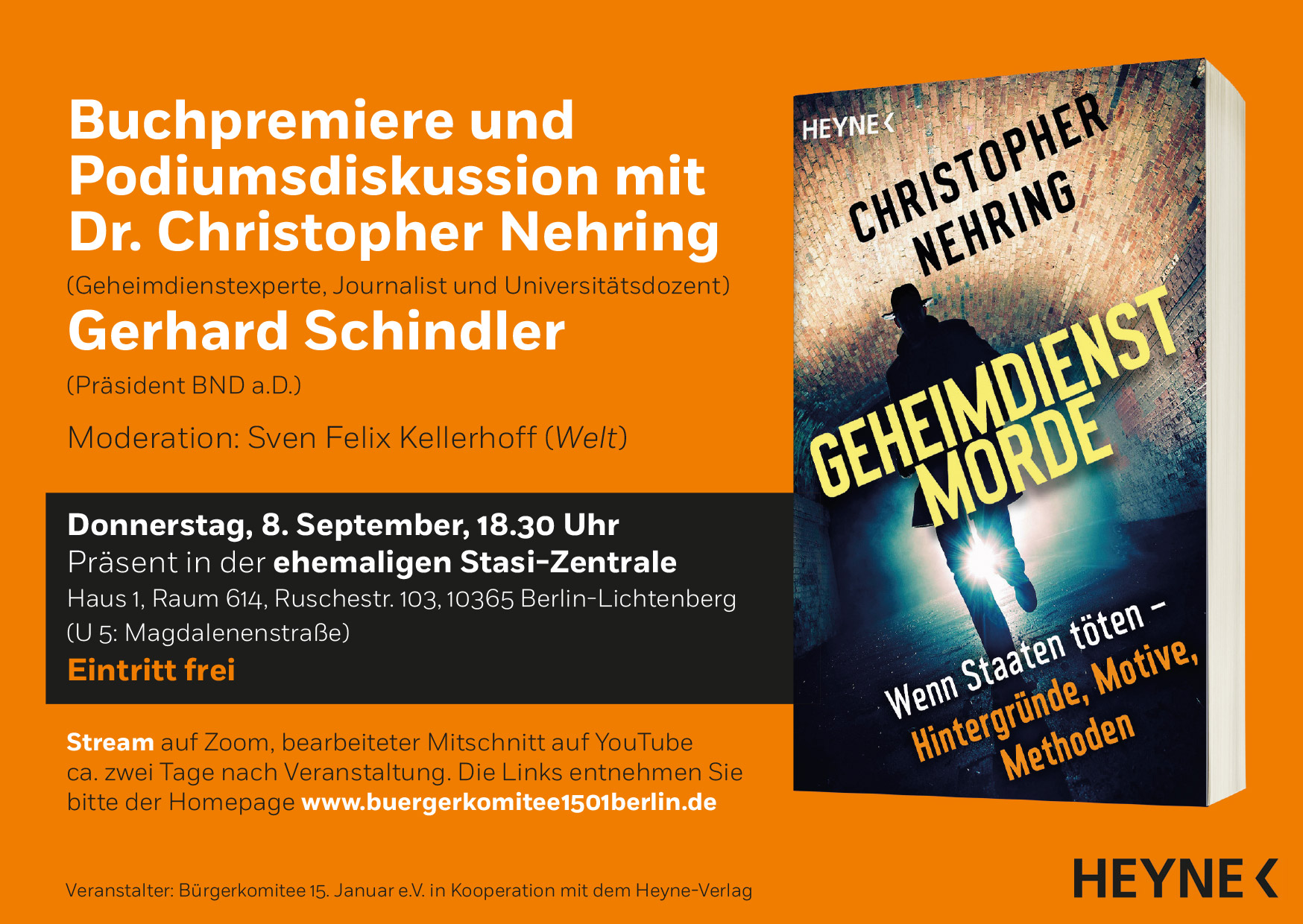 Christopher Nehring hat in seinem Buch erstmals einen vergleichenden Gesamtüberblick über Geheimdienstmorde vorgelegt. Zur Premiere diskutiert er mit dem ehemaligen deutschen Geheimdienstchef Präsidenten Gerhard Schindler über Stasi-Morde,